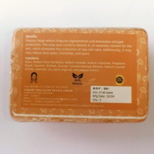 Reveal naturally radiant and healthy-looking skin with YogKart Natural Papaya Soap, thoughtfully crafted to enhance your daily skincare routine. This gentle yet effective soap is enriched with pure papaya extract and Vitamin A, known for their skin-renewing and brightening properties. Papaya is rich in natural enzymes like papain, which help exfoliate dead skin cells, unclog pores, and promote a clearer, more even complexion. With regular use, it helps visibly reduce uneven pigmentation, dark spots, blemishes, acne marks, and mild scars, restoring your skin’s natural glow.